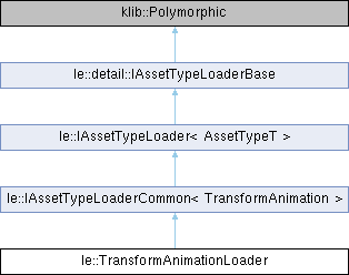 Public Member Functions inherited from le::IAssetTypeLoaderCommon< TransformAnimation > | |